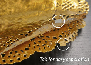 Quantity: 50x gold doilies. (Comes machine pressed/cut in stacks of fifty so you will just have to separate each doily before use. There is small tab as shown above on each doily to assist in separating each thin layer.)