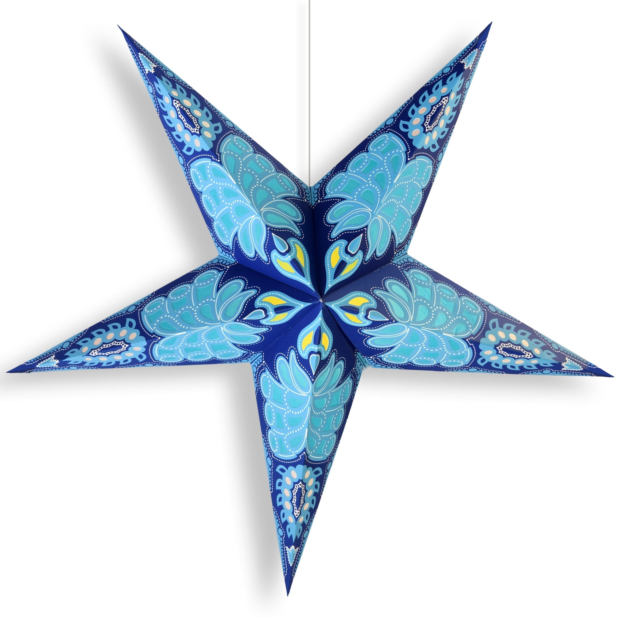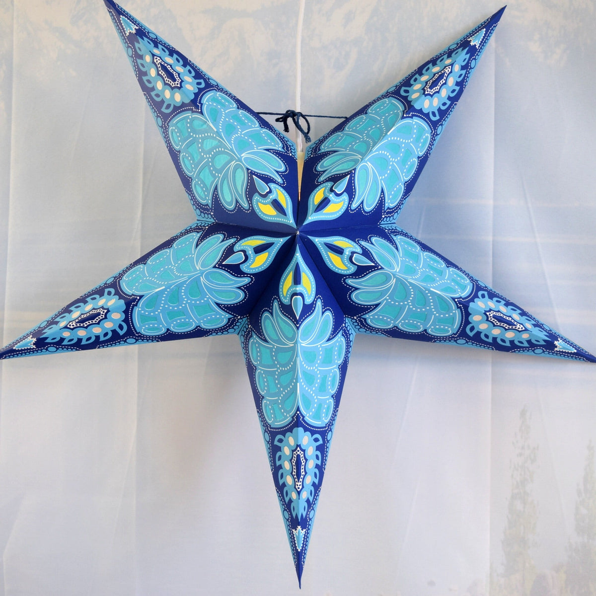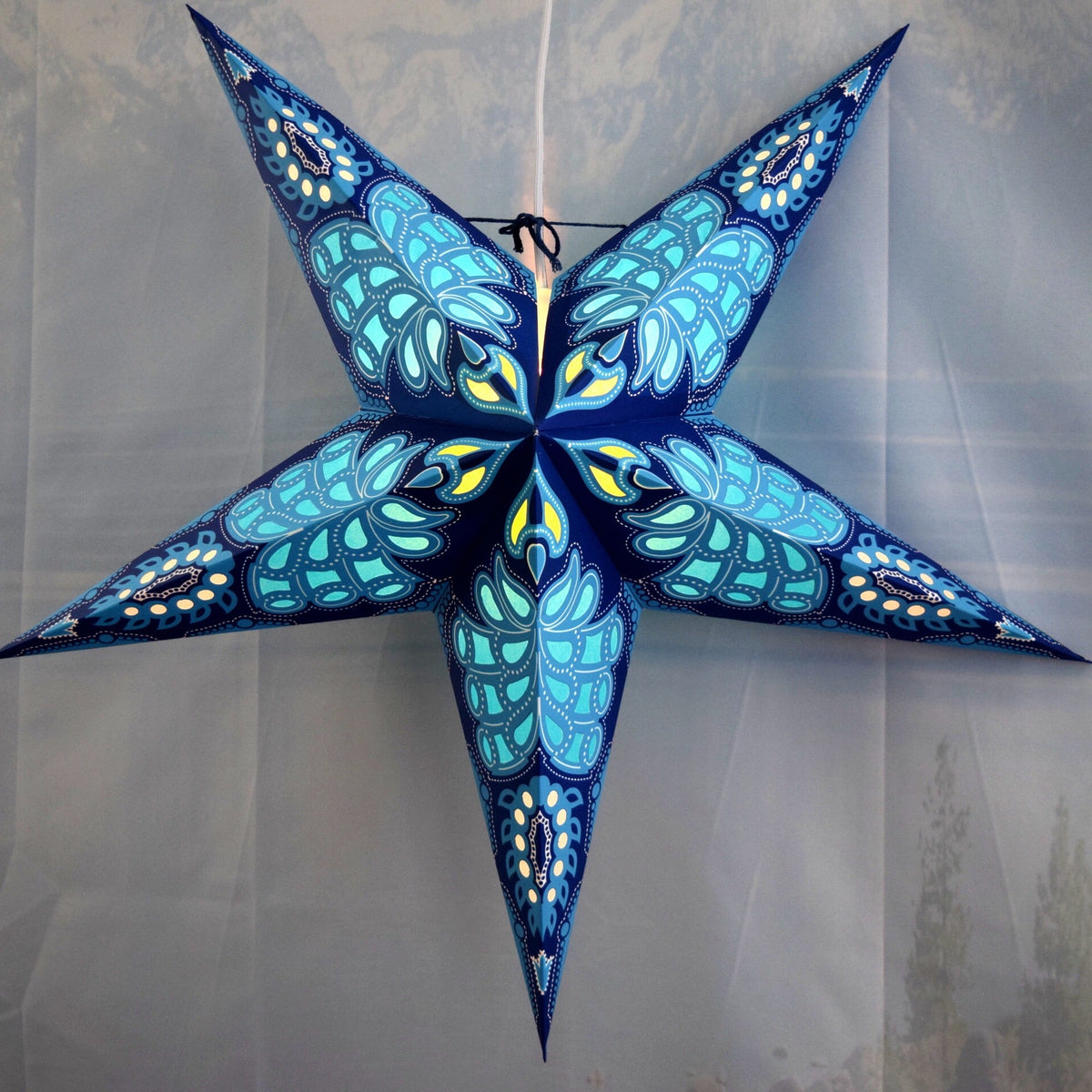 Luna Bazaar's hand-crafted hanging Paper Star Lanterns are beautiful as a home decor accessory or as an outdoor Wedding decoration. These star lantern lamps are high-quality - made from thick paper and punched with a special star design. Available in many colors and patterns, our unique star lanterns can be seen hung on the sets of many Hollywood movies and TV shows. Our stars will make a beautiful display or decoration in any room in the home. They add a fun touch to any party or event and you can pair with one of our lamp cord kits to create wonderful ambiance lighting.