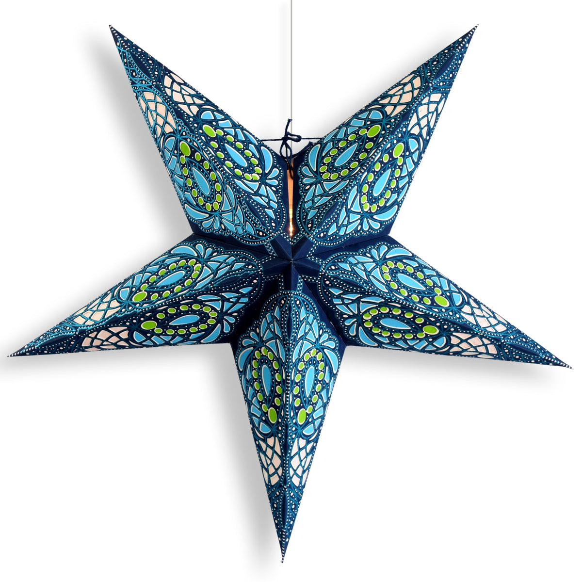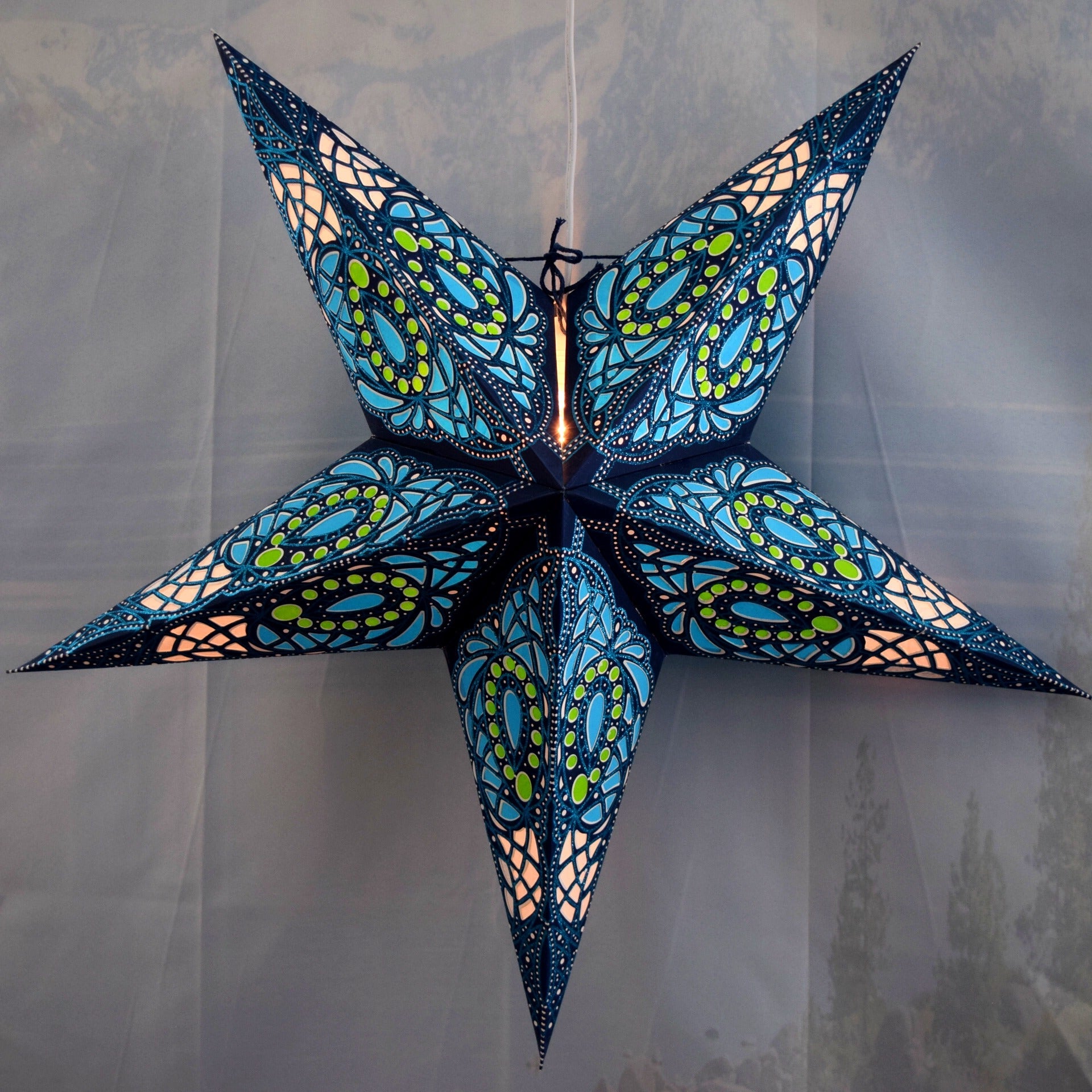 Luna Bazaar's hand-crafted hanging Paper Star Lanterns are beautiful as a home decor accessory or as an outdoor Wedding decoration. These star lantern lamps are high-quality - made from thick paper and punched with a special star design. Available in many colors and patterns, our unique star lanterns can be seen hung on the sets of many Hollywood movies and TV shows. Our stars will make a beautiful display or decoration in any room in the home. They add a fun touch to any party or event and you can pair with one of our lamp cord kits to create wonderful ambiance lighting.