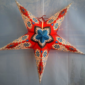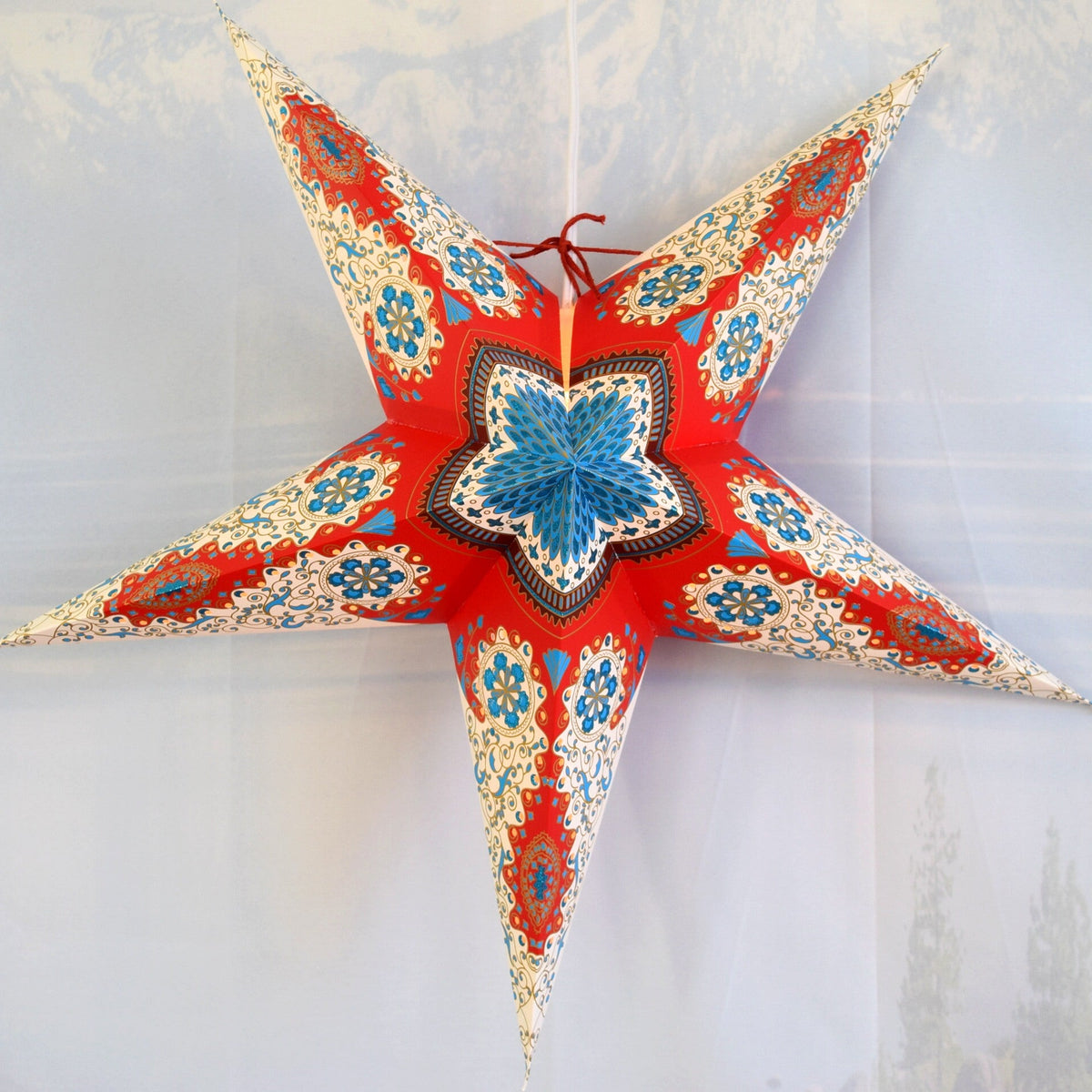 Luna Bazaar's hand-crafted hanging Paper Star Lanterns are beautiful as a home decor accessory or as an outdoor Wedding decoration. These star lantern lamps are high-quality - made from thick paper and punched with a special star design. Available in many colors and patterns, our unique star lanterns can be seen hung on the sets of many Hollywood movies and TV shows. Our stars will make a beautiful display or decoration in any room in the home. They add a fun touch to any party or event and you can pair with one of our lamp cord kits to create wonderful ambiance lighting.