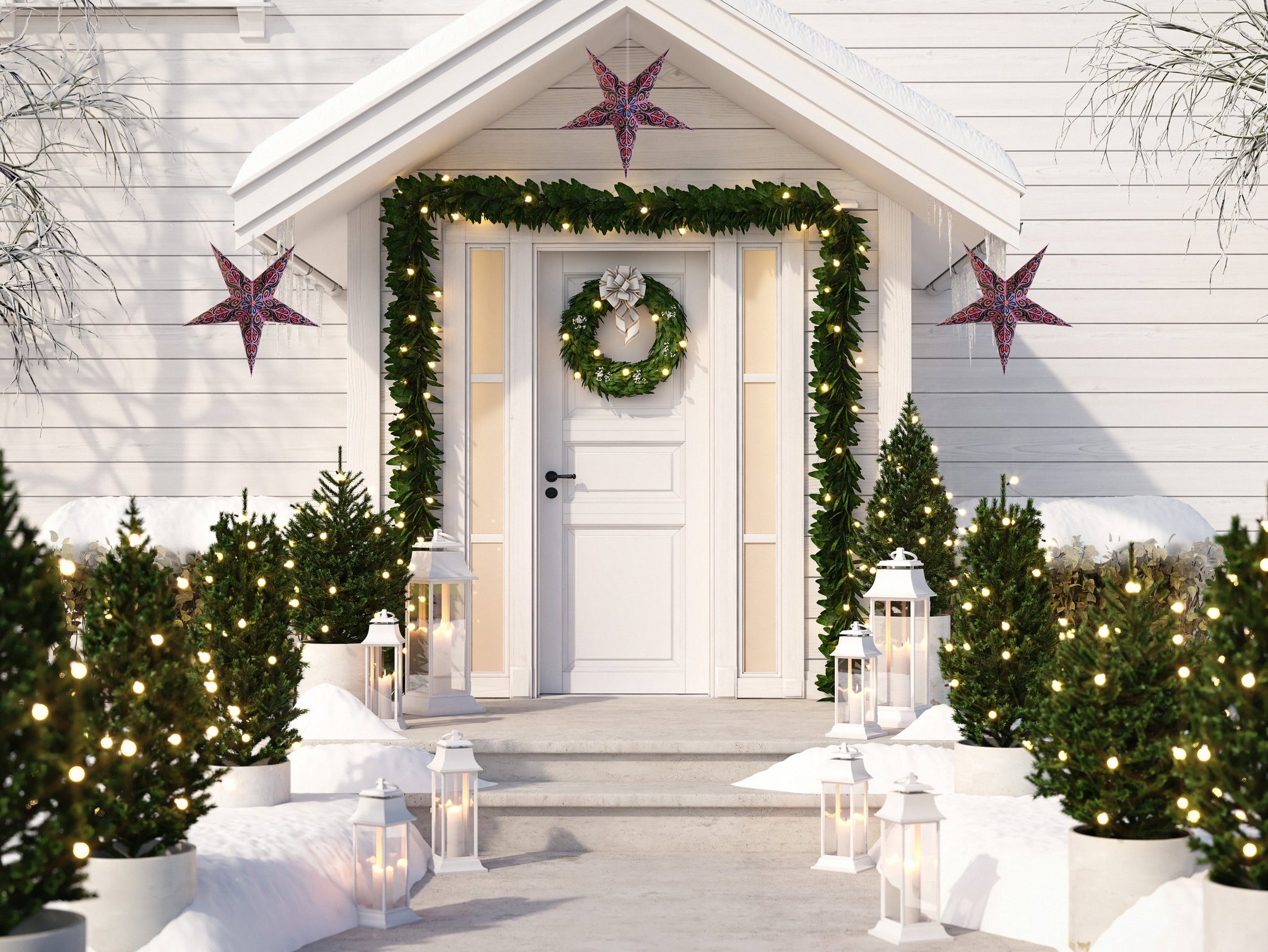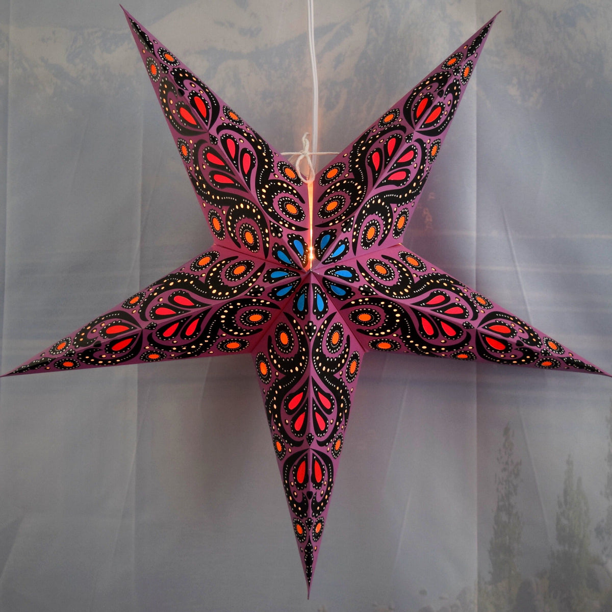 Luna Bazaar's hand-crafted hanging Paper Star Lanterns are beautiful as a home decor accessory or as an outdoor Wedding decoration. These star lantern lamps are high-quality - made from thick paper and punched with a special star design. Available in many colors and patterns, our unique star lanterns can be seen hung on the sets of many Hollywood movies and TV shows. Our stars will make a beautiful display or decoration in any room in the home. They add a fun touch to any party or event and you can pair with one of our lamp cord kits to create wonderful ambiance lighting.