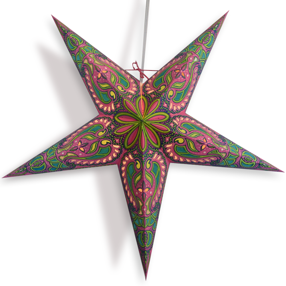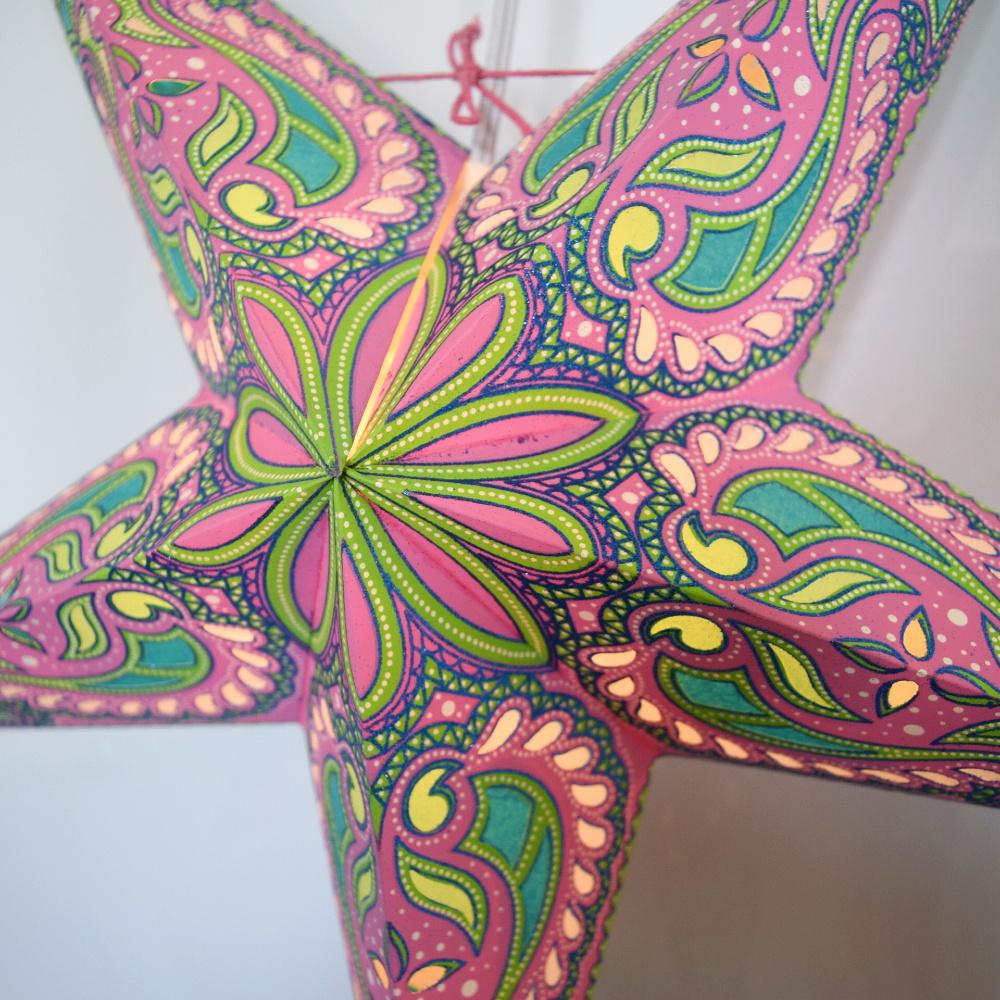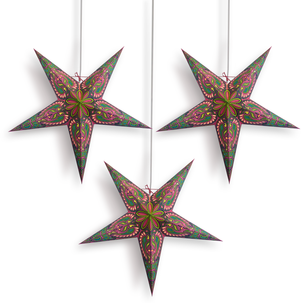 3-PACK 24 Inch Pink Green Alaskan Glitter Paper Star Lantern, with LED Bulbs and Lamp Cord Light Included