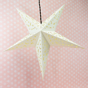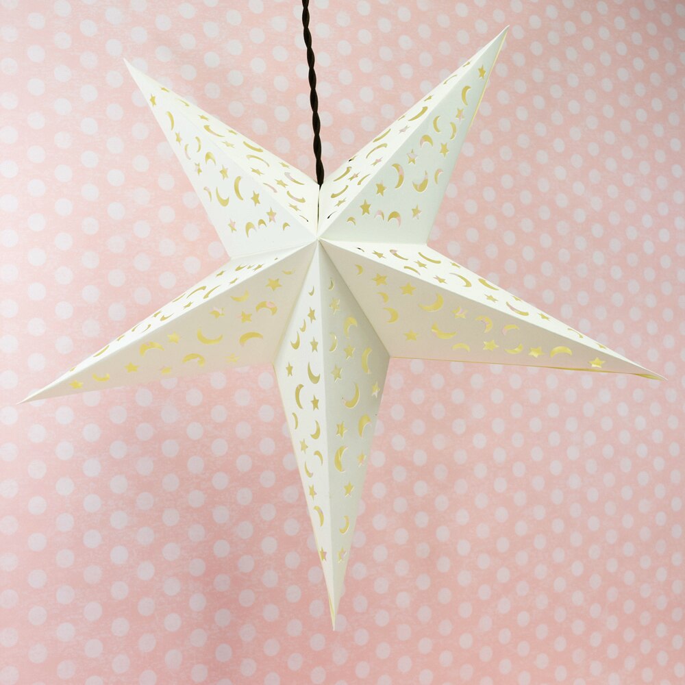 Luna Bazaar's hand-crafted hanging Paper Star Lanterns are beautiful as a home decor accessory or as an outdoor Wedding decoration. These star lantern lamps are high-quality - made from thick paper and punched with a special design. Available in many colors and patterns, our unique star lanterns have been seen hung on walls and ceilings on TV shows, movies and at concerts. These star lantern lamps are high-quality - made from thick paper and punched with a special star design. Makes a beautiful display or decoration in any room in the home when paired with one of our lamp cord kits.
