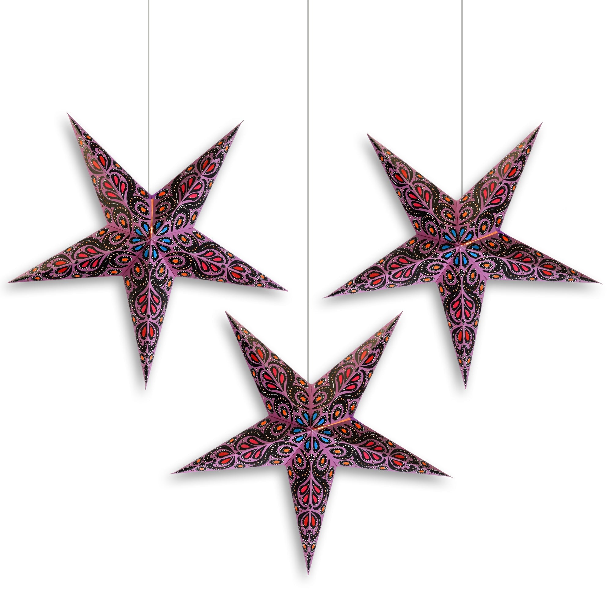 Introducing Luna Bazaar’s hand-crafted hanging Paper Star Lantern KIT, perfect for adding a unique and decorative touch to your home or event. Each kit includes a beautifully designed star lantern, a triple-socket pendant light cord, and 3x LED light bulbs, making it a complete lighting solution. These high-quality lanterns are crafted from thick paper and feature intricate, punched star designs. Whether for home décor or as a stunning centerpiece for weddings and parties, our star lanterns create a magical ambiance in any setting.