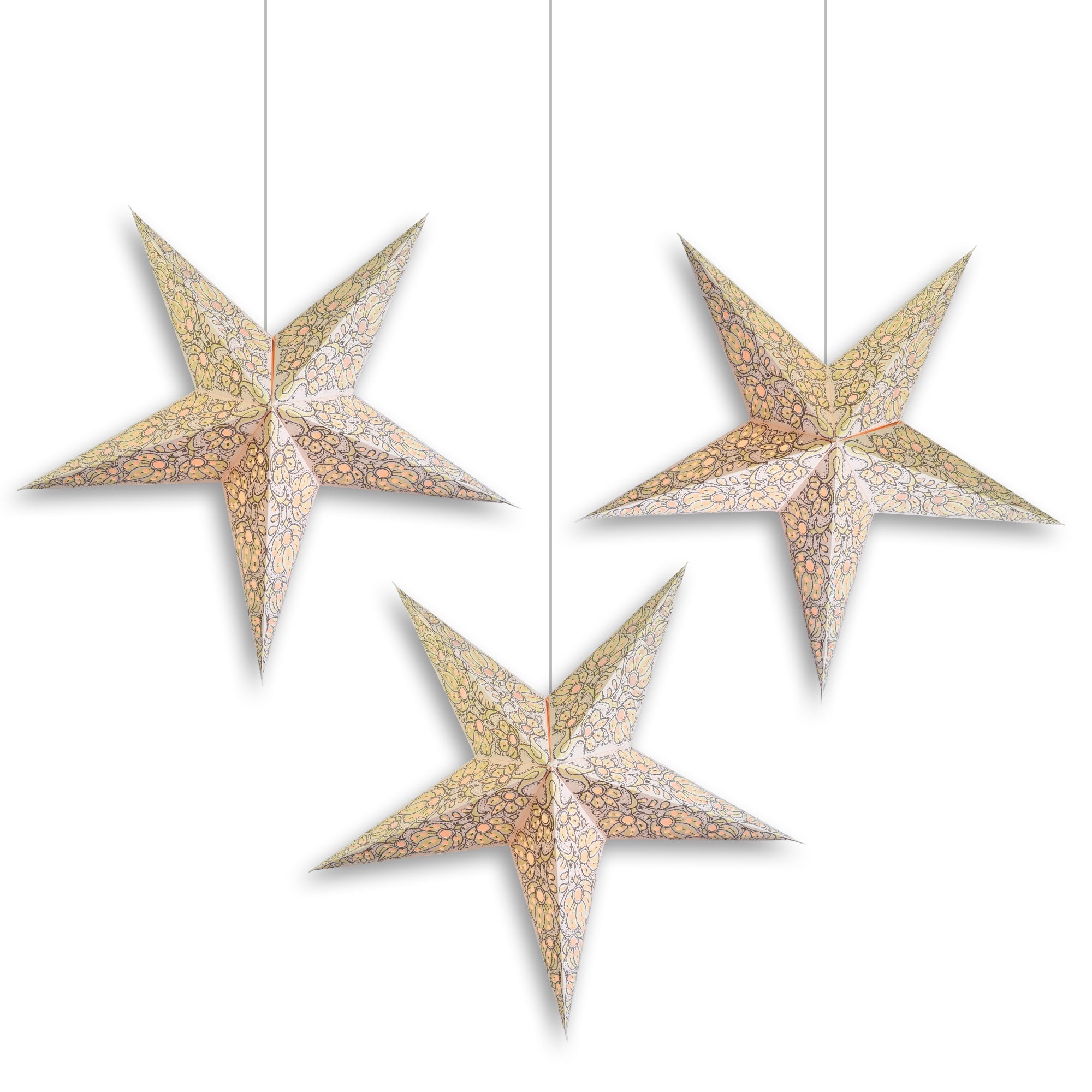 Introducing Luna Bazaar’s hand-crafted hanging Paper Star Lantern KIT, perfect for adding a unique and decorative touch to your home or event. Each kit includes a beautifully designed star lantern, a triple-socket pendant light cord, and 3x LED light bulbs, making it a complete lighting solution. These high-quality lanterns are crafted from thick paper and feature intricate, punched star designs. Whether for home décor or as a stunning centerpiece for weddings and parties, our star lanterns create a magical ambiance in any setting.