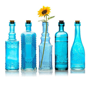 Our new Bohemian Collection of Vintage Turquoise Blue Glass Bottles and flower vases are perfect for your Wedding dinner party, holiday event or as everyday home decor. This assortment of bottles is made of thick glass and makes for great DIY decorations for dinner settings and Wedding favors . Accent these antique bottles with our Twine / String or Burlap materials for that trendy Rustic look and pair with all of our other Table Top decorations like Candle Holders and votive Tea Lights .