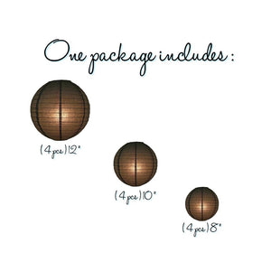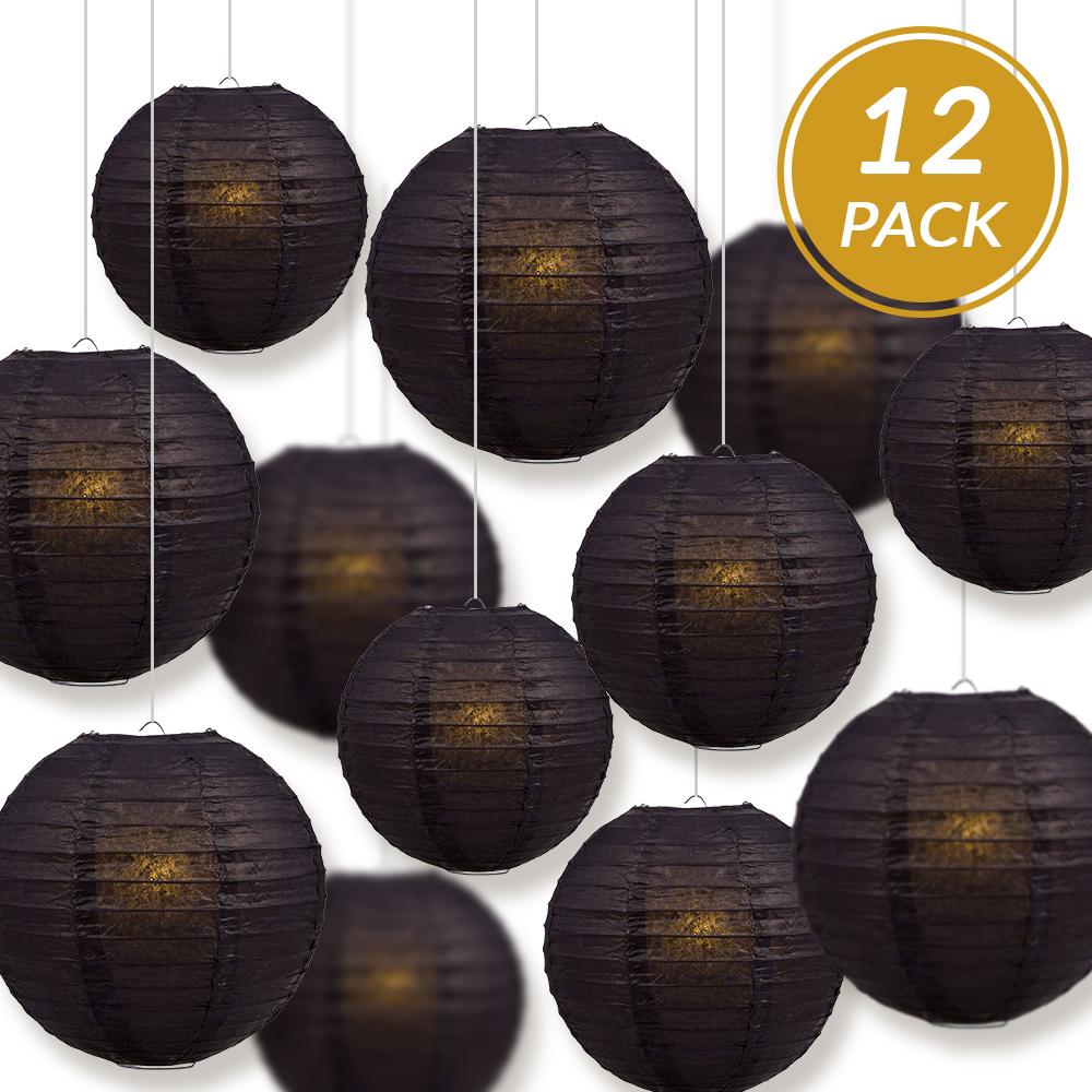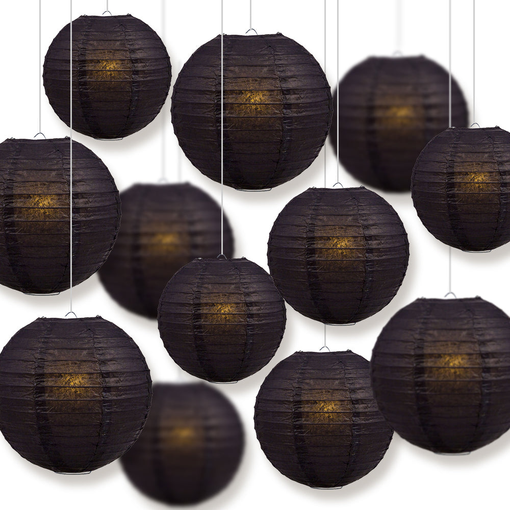 Our convenient Black Paper Lantern Party Packs feature a 12-piece assortment of different sizes in a lovely black Chinese Paper Lanterns. Perfect for birthday parties, Weddings and baby showers, string these paper lanterns up on Patio String Lights to create an awe-inspiring hanging decoration your guests will talk about for years! Our traditional Chinese lanterns can also be clustered for that eye-catching look or placed in and around the home for budget friendly DIY lighting.