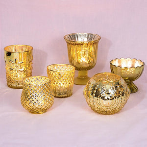 Composed of 6 unique shapes & sizes of vintage glam mercury glass tealight candle holders, this set is the most practical gift for loved ones & yourself! Each votive candle holder comes with an antiqued metallic finish, perfect for adding a touch of elegance to any table setting, home decor, dinner party, holiday decorating (Christmas & Halloween), weddings, or special occasions