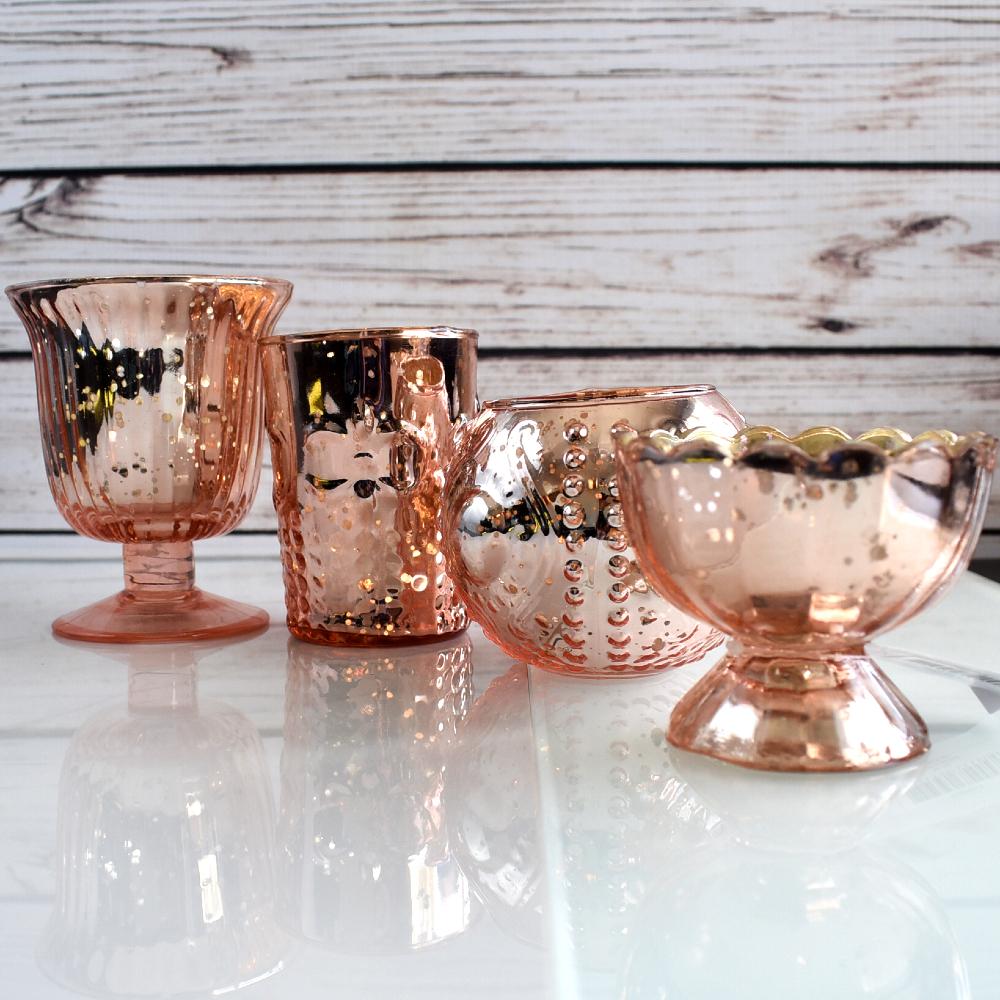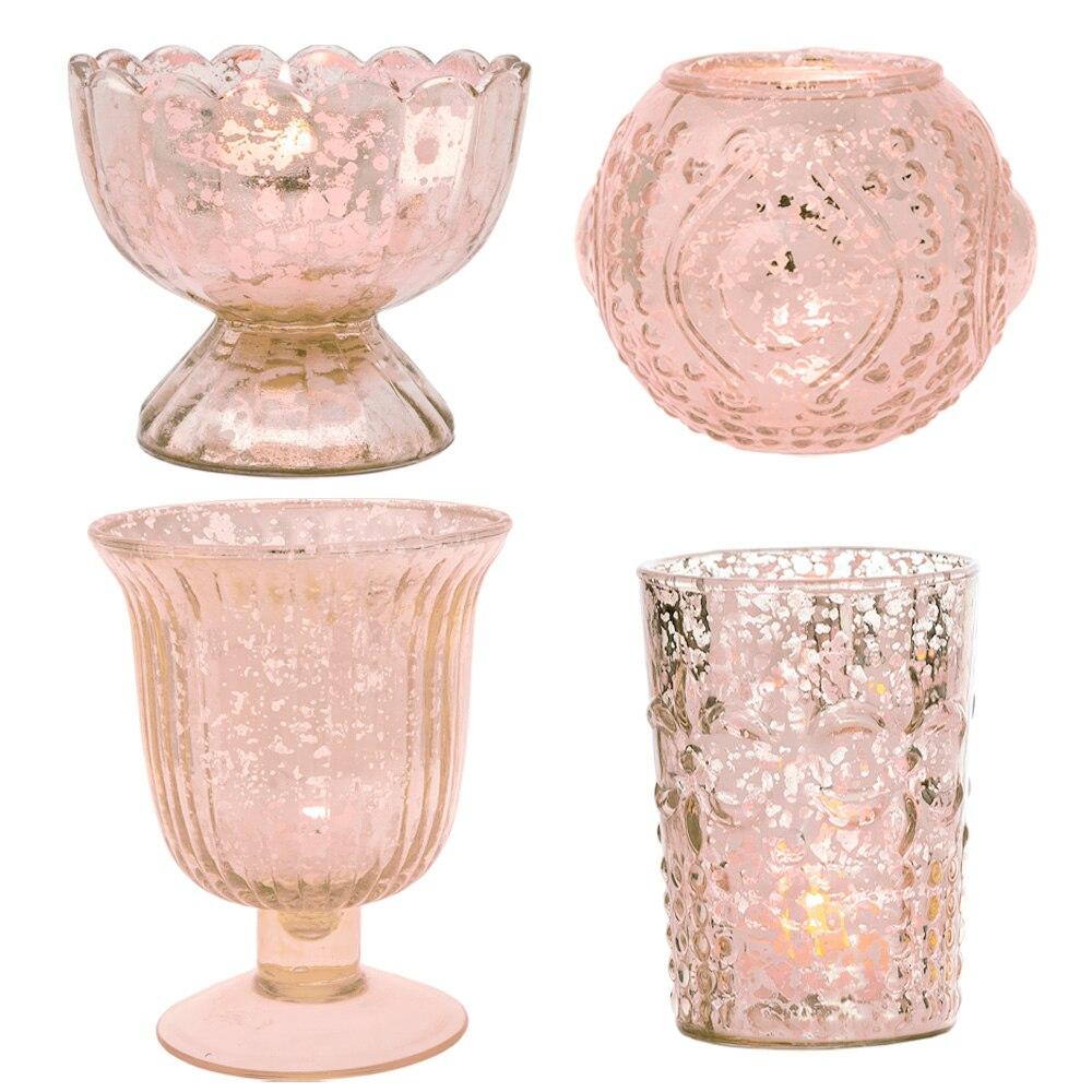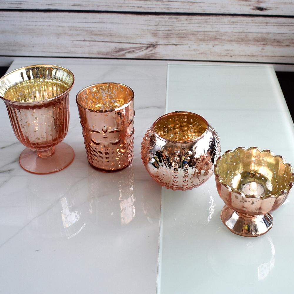 Composed of 4 unique shapes & sizes of vintage glam mercury glass tealight candle holders, this set is the most practical gift for loved ones & yourself! Each votive candle holder comes with an antiqued metallic finish, perfect for adding a touch of elegance to any table setting, home decor, dinner party, holiday decorating (Christmas & Halloween), weddings, or special occasions