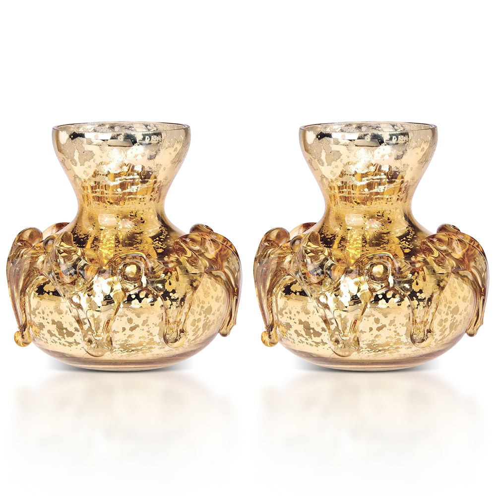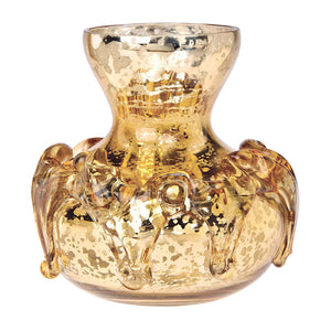 The antiqued metallic finish of this gold mercury glass vase is reflective and shimmery. It features a pot bellied, intricately shaped pyriform body and art deco dripped glass creates a unique, classy standalone decor accent, bud or flower vase design ideal for home or party decors. Not intended for food use.