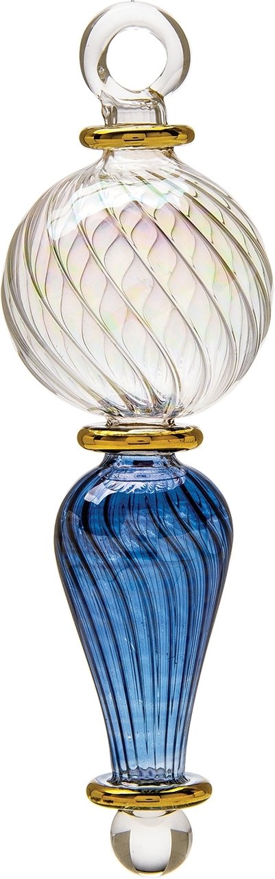 Epitomize the exotic this holiday season with our blue and clear Egyptian hand-blown glass Christmas ornaments. Each unique egyptian ornament is etched with gold lines and handcrafted by exceptionally skilled artisans in a centuries-old tradition of glass blowing. These beautiful glass ornaments are true treasures and will make great gifts and distinctive decorations for the coming season.