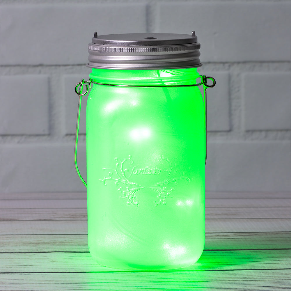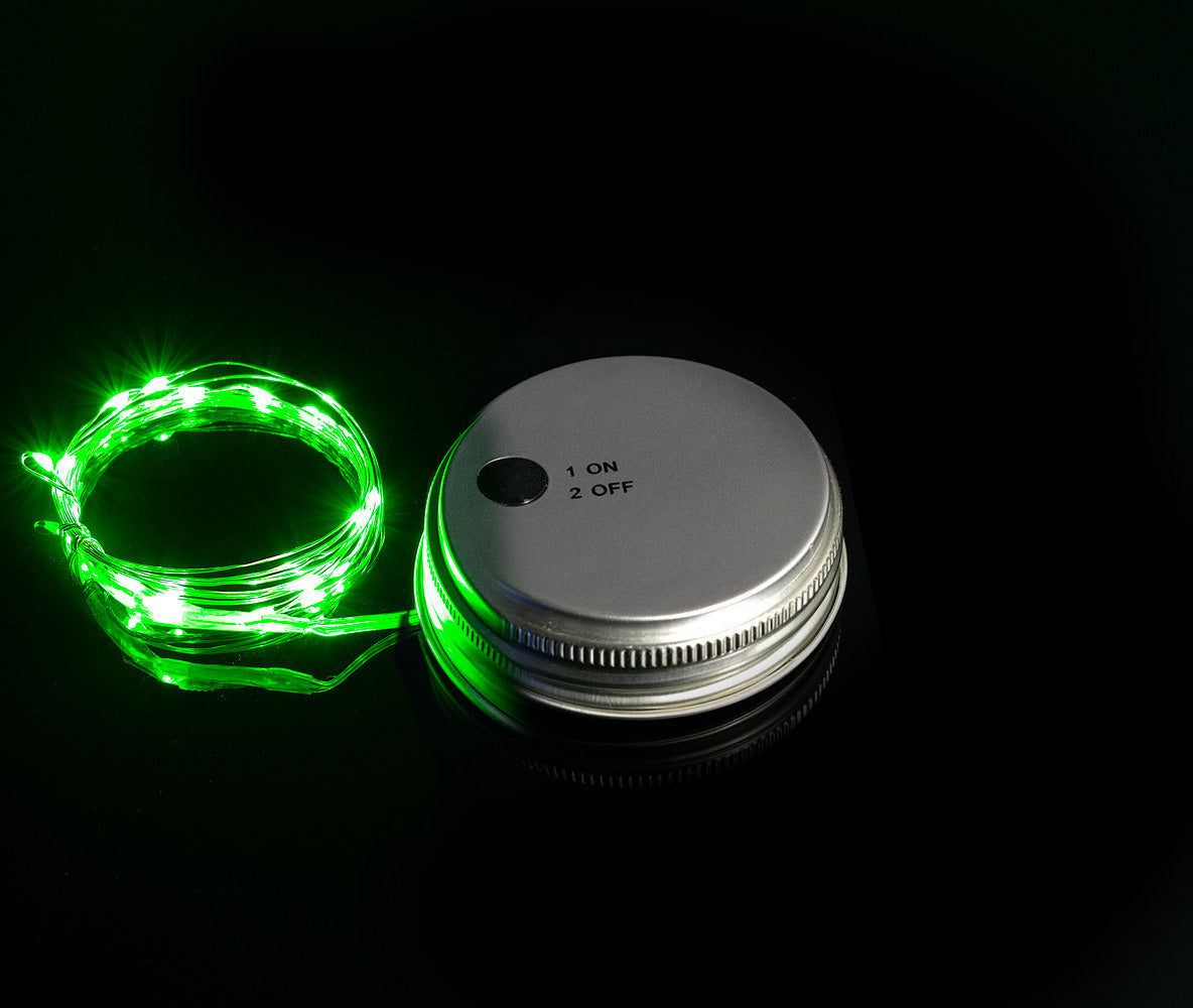 This Batter Powered LED Mason Jar Light in green can be used with any wide mouth mason jar. Includes 20 LEDs which are attached to a thin copper wire, wires are attached to a built in battery unit affixed to the lid.