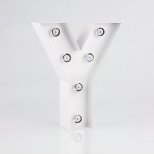 These vintage-like marquee letter glamour lights are professionally made and are extremely popular as 3D room decoration and event signage. Each battery powered letter is made of heavy, solid metal and can be hung (has keyhole slot in back for easy hanging) on walls, placed on top of a reception tables or even on mantels. Newlyweds can highlight their wedding by combining their first initials with an "&" to create their own signature on the cake or candy table during their reception. Our illuminated marquee lights are portable and highly versatile. They measure 8 inches tall, 2 inches thick, and will take 2x AA batteries so they are not required to be placed near an outlet.