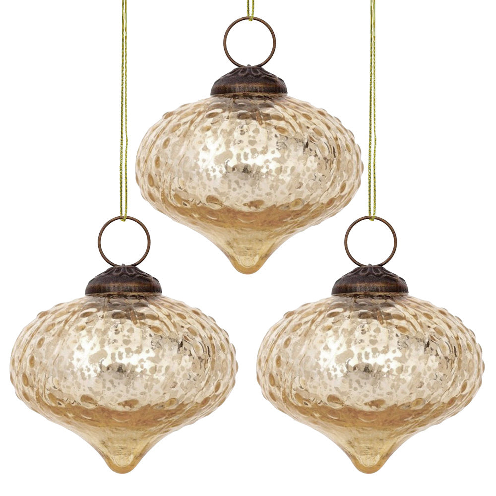 Our Vintage Christmas ornaments feature an antiqued Gold metallic finish. These faceted mercury glass dotted drop ornaments are exceptionally elegant and shimmery Christmas ornaments. Use for holiday decorating or any special occasion.