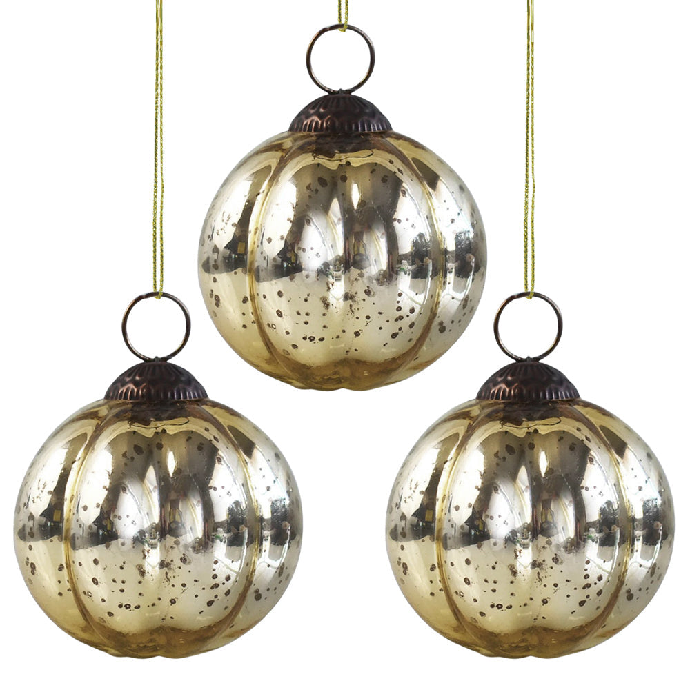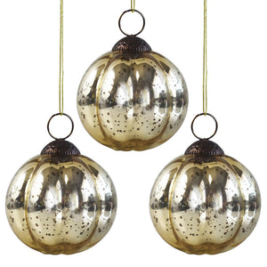 Our Vintage Christmas ornaments feature an antiqued Gold metallic finish. These faceted mercury glass pumpkin ornaments are exceptionally elegant and shimmery Christmas ornaments. Use for holiday decorating or any special occasion.