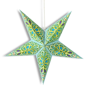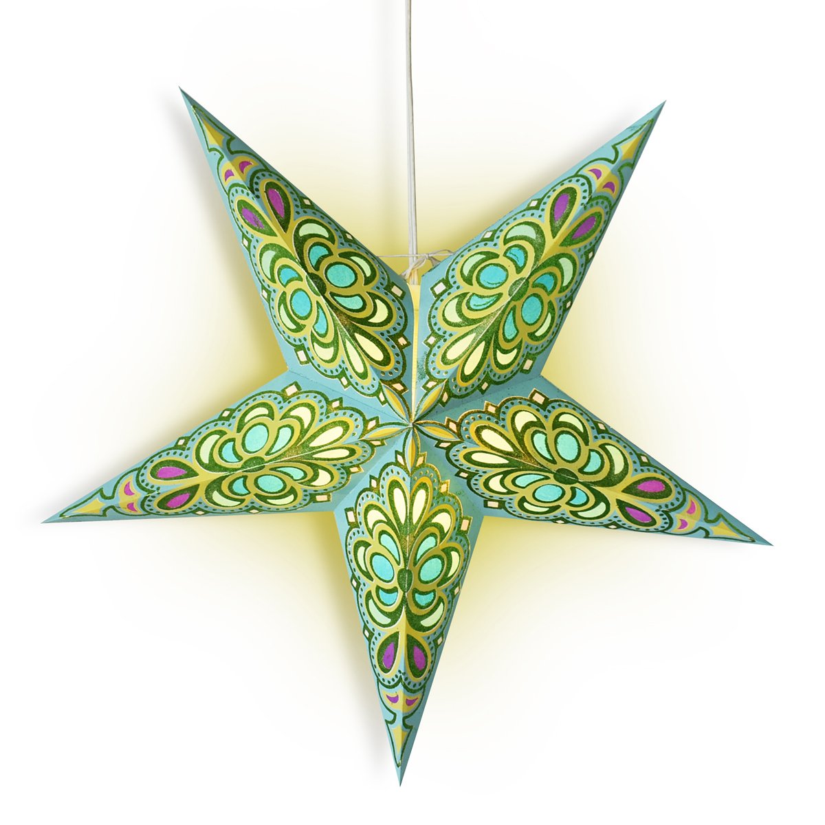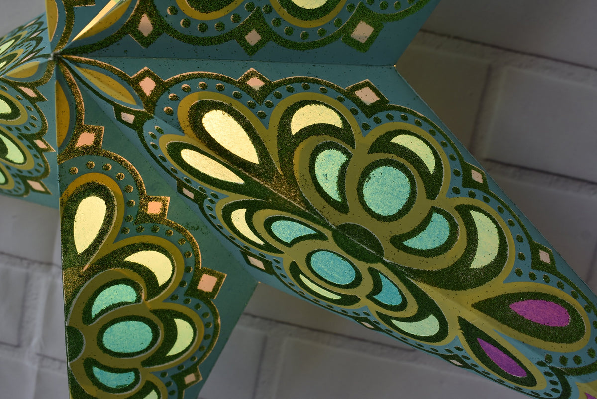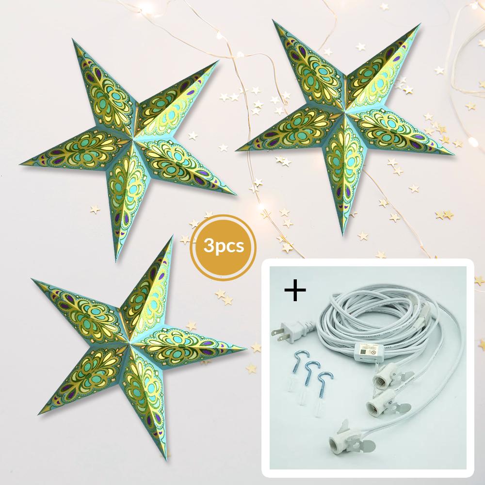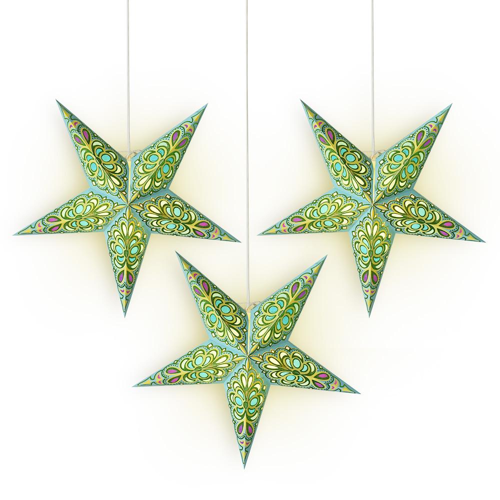 3-PACK Green / Turquoise Merry Glitter 24 Inch Illuminated Paper Star Lantern, with LED Bulbs and Lamp Cord Light Included