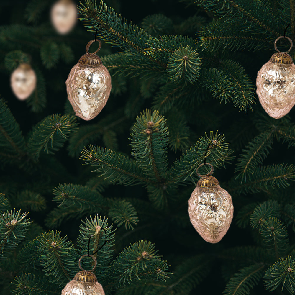 Get that designer's edge from these mercury glass Christmas decorations with a vintage green, pearl white, silver or gold color that easily complements any theme or color scheme, allowing you to decorate with ease!