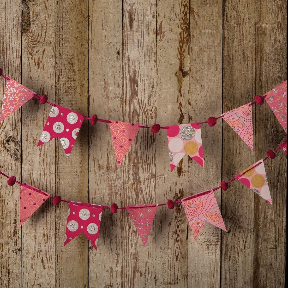 Material: Paper Dimensions: 9.5 feet in length. Triangles measure approximately 3.25 inches wide x 4.5 inches high. Pennants measure approximately 3.5 inches wide x 4.5 inches high. Color: Pink