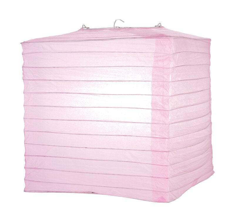 Pink Paper Lanterns box square paper lanterns. Lantern is held open with a wire expander. Lantern is beautiful with wire ribbings.Dimensions: 10"Sq. (All lanterns sold without cord, cord must be purchased separately)