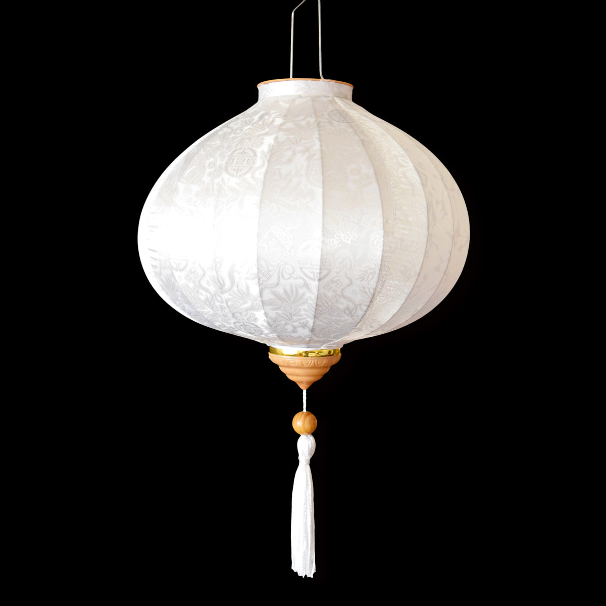 These Vietnamese Silk Lantern in a diamond shape are made from 100% Brocade silk fabric with weave designs stretched over a high-quality metal frame. These Silk Lanterns look beautiful for any event or stage setting and are meant to bring good fortune.