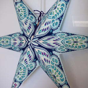 24" Turquoise Blue Peacock Glitter 6-Point Paper Star Lantern, Hanging
