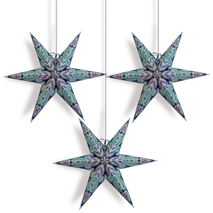 3-PACK Turquoise Blue Peacock Glitter 24 Inch Illuminated 6-Point Paper Star Lantern, with LED Bulbs and Lamp Cord Light Included
