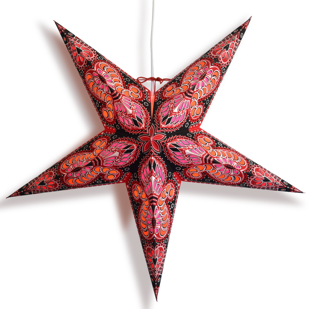 LunaBazaar's hand-crafted hanging Paper Star Lanterns are beautiful as a home decor accessory or as an outdoor Wedding decoration. These star lantern lamps are high-quality - made from thick paper and punched with a special star design. Available in many colors and patterns, our unique star lanterns can be seen hung on the sets of many Hollywood movies and TV shows. Our stars come from direct from India and will make a beautiful display or decoration in any room in the home. They add a fun touch to any party or event and you can pair with one of our lamp cord kits to create wonderful ambiance lighting.