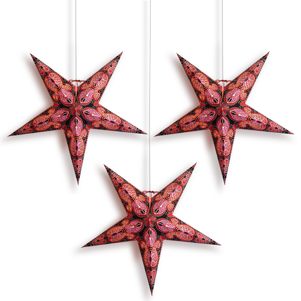 3-PACK Red Black Peacock 24 Inch Illuminated Paper Star Lantern, with LED Bulbs and Lamp Cord Light Included