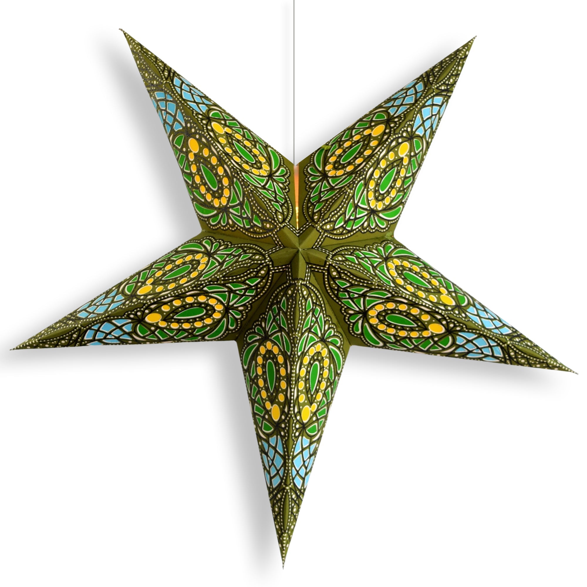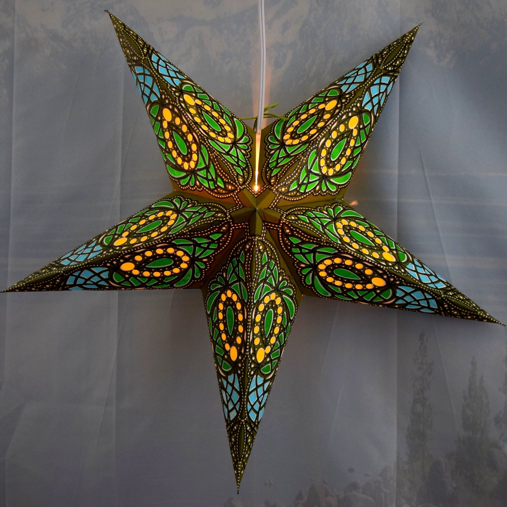 Introducing Luna Bazaar’s hand-crafted hanging Paper Star Lantern KIT, perfect for adding a unique and decorative touch to your home or event. Each kit includes a beautifully designed star lantern, a pendant light cord, and an LED light bulb, making it a complete lighting solution. These high-quality lanterns are crafted from thick paper and feature intricate, punched star designs. Whether for home décor or as a stunning centerpiece for weddings and parties, our star lanterns create a magical ambiance in any setting.