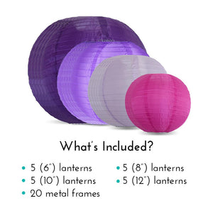 Our convenient Purple, Light Purple, Dark Purple, and Violet Nylon Lantern Party Packs like this ultimate 20-piece assortment includes a combination of different-sized Chinese Nylon Lanterns perfect for birthday parties, Weddings and baby showers. String these up on Patio String Lights in your backyard to create an awe-inspiring hanging decoration your guests will talk about for years! Our lanterns can also be clustered for that eye-catching look or placed in and around the home! Our shimmering Nylon Lanterns, or traditional Chinese Lanterns, are the perfect decorating idea for those looking for that unique style and stunningly beautiful ambiance. Decorative Round Nylon Lanterns are a great, budget-friendly DIY choice that can be hung anywhere.