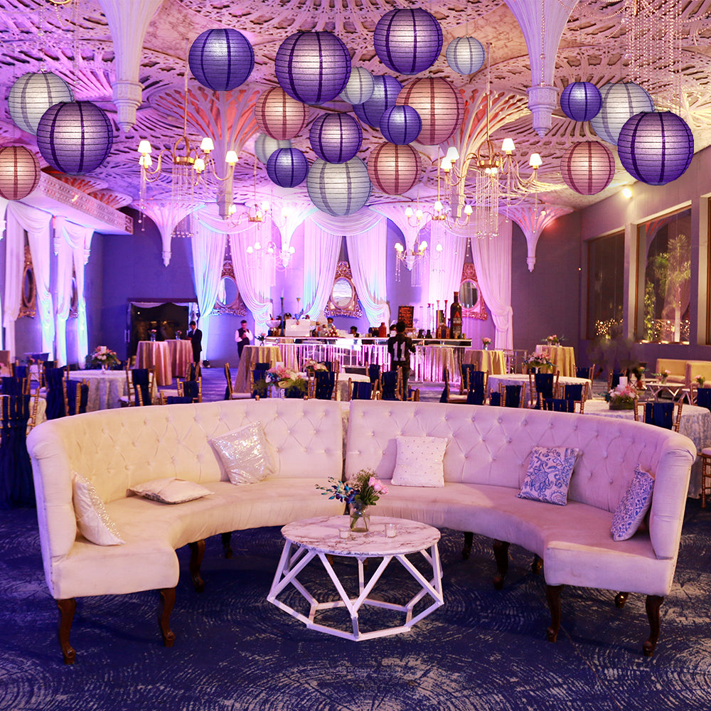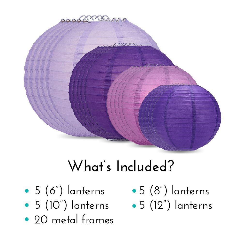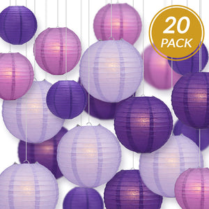 Our convenient Purple, Lavender, Violet and Plum Paper Lantern Party Packs like this ultimate 20-piece assortment includes a combination of different-sized Chinese Paper Lanterns perfect for birthday parties, White Paper Lanterns being the most popular. Mix-and-match different sizes ranging from 4" all the way to giant 42" xl paper lanterns to match your Rustic Chic, Classical, Vintage or Barn theme. Paper Lanterns can be hung on our outdoor Style: Parallel Ribbing