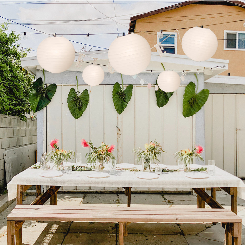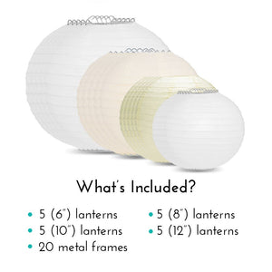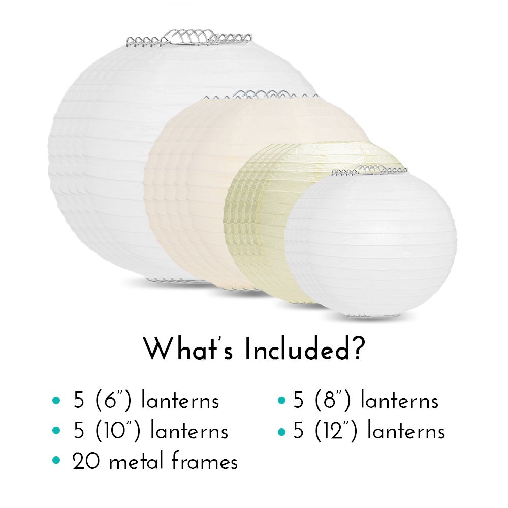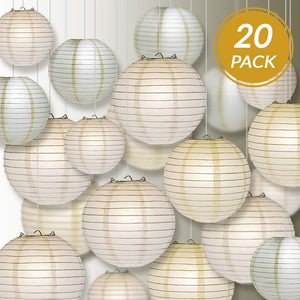 Our convenient White, Beige, and Ivory Paper Lantern Party Packs like this ultimate 20-piece assortment includes a combination of different-sized Chinese Paper Lanterns perfect for birthday parties, White Paper Lanterns being the most popular. Mix-and-match different sizes ranging from 4" all the way to giant 42" xl paper lanterns to match your Rustic Chic, Classical, Vintage or Barn theme. Paper Lanterns can be hung on our outdoor Style: Parallel Ribbing