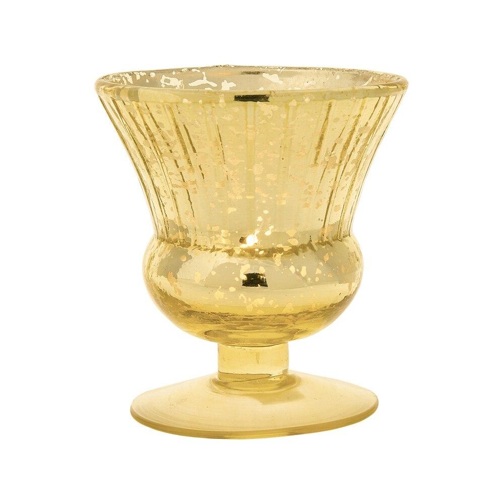 MERCURY GLASS CANDLE HOLDERS: These small urn mercury glass candle holders measure 3.25-inch diameter x 3.5 inches high. Antiqued metallic gold mercury finish, these tea light holders easily compliment virtually any color scheme.