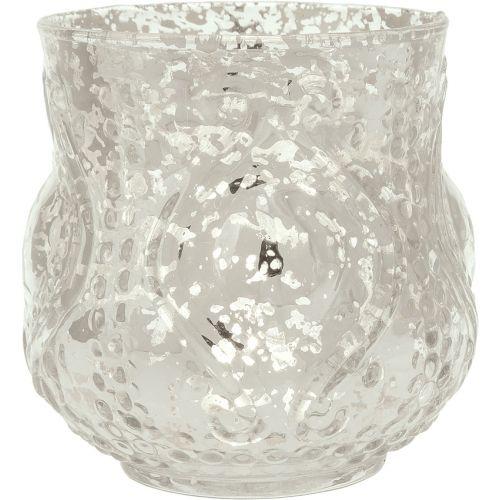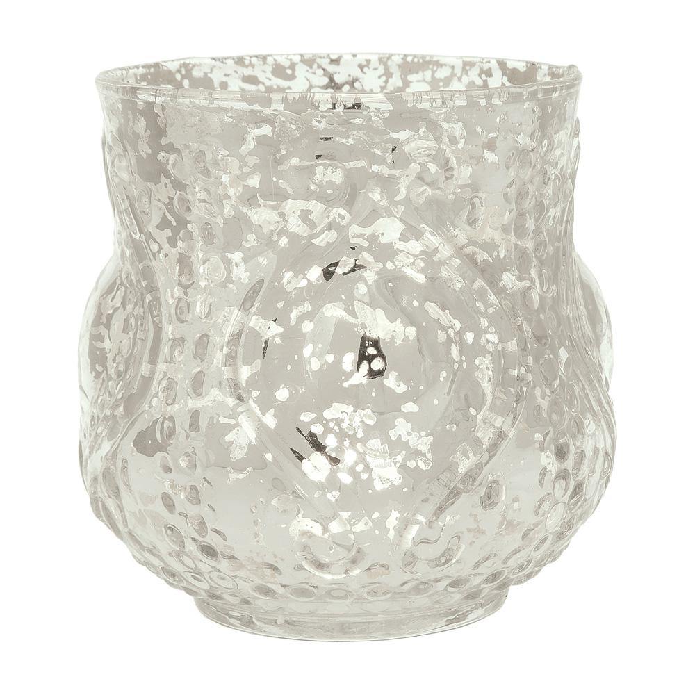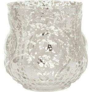 MERCURY GLASS CANDLE HOLDERS: These large henna design mercury glass candle holders measure 4-inch diameter x 4 inches high. Antiqued metallic silver mercury finish, these tea light holders easily compliment virtually any color scheme.
