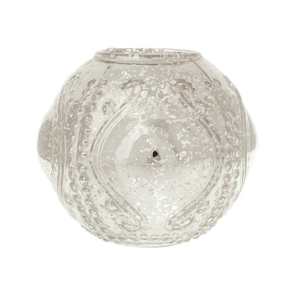 MERCURY GLASS CANDLE HOLDERS: These large rounded henna design mercury glass candle holders measure 5.75-inch diameter x 5.75 inches high. Antiqued metallic silver mercury finish, these tea light holders easily compliment virtually any color scheme.