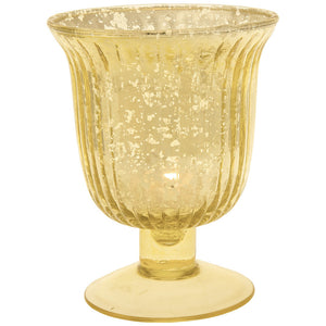 The antiqued metallic finish of this gold mercury glass vase is reflective and shimmery. These urn vases feature a columned design and a beautifully shaped pyriform body with features that create a unique, classy standalone decor accent, bud or flower vase design ideal for home or party decors. Not intended for food use.