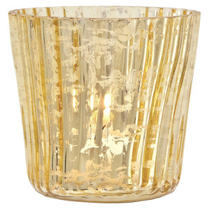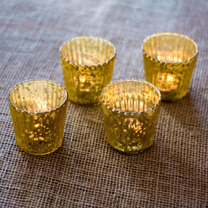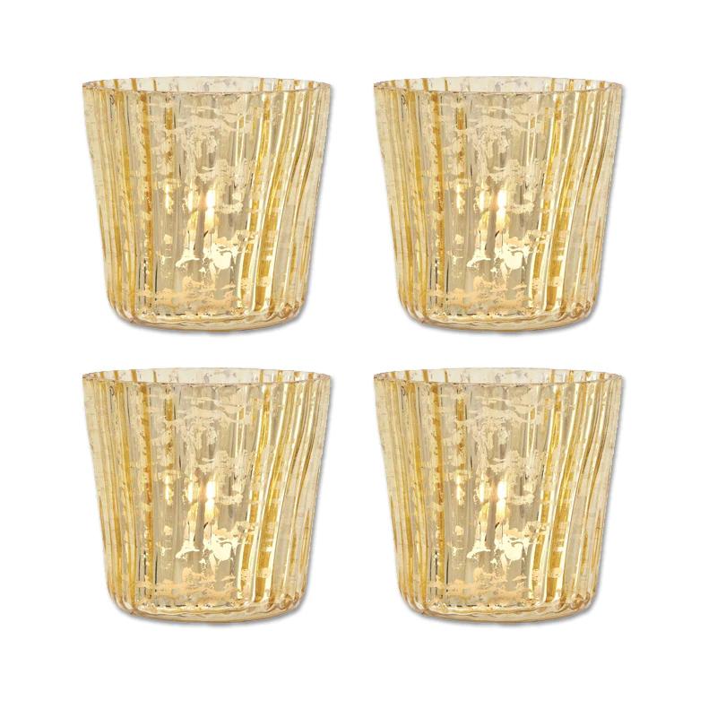 MERCURY GLASS CANDLE HOLDERS SET OF 4: These vertical line design mercury glass candle holders measure 3-inch diameter x 3 inches high. Antiqued metallic gold mercury finish, these tea light holders easily compliment virtually any color scheme.