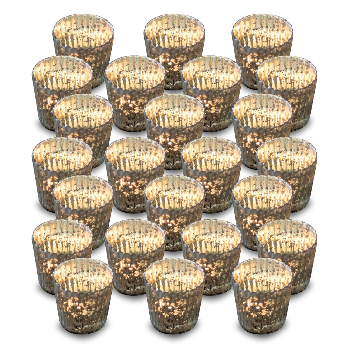 STUNNING SILVER MERCURY GLASS CANDLE HOLDERS: Set of 24 - This shimmering candle holder is one of our hottest designs! 3 inches x 3 inches high.