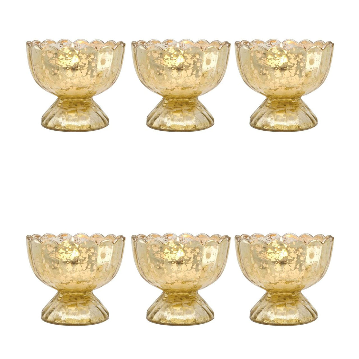 Our gold rounded chalice mercury glass candle holder is the perfect addition to your holiday tables or as gifts for your wedding guests!