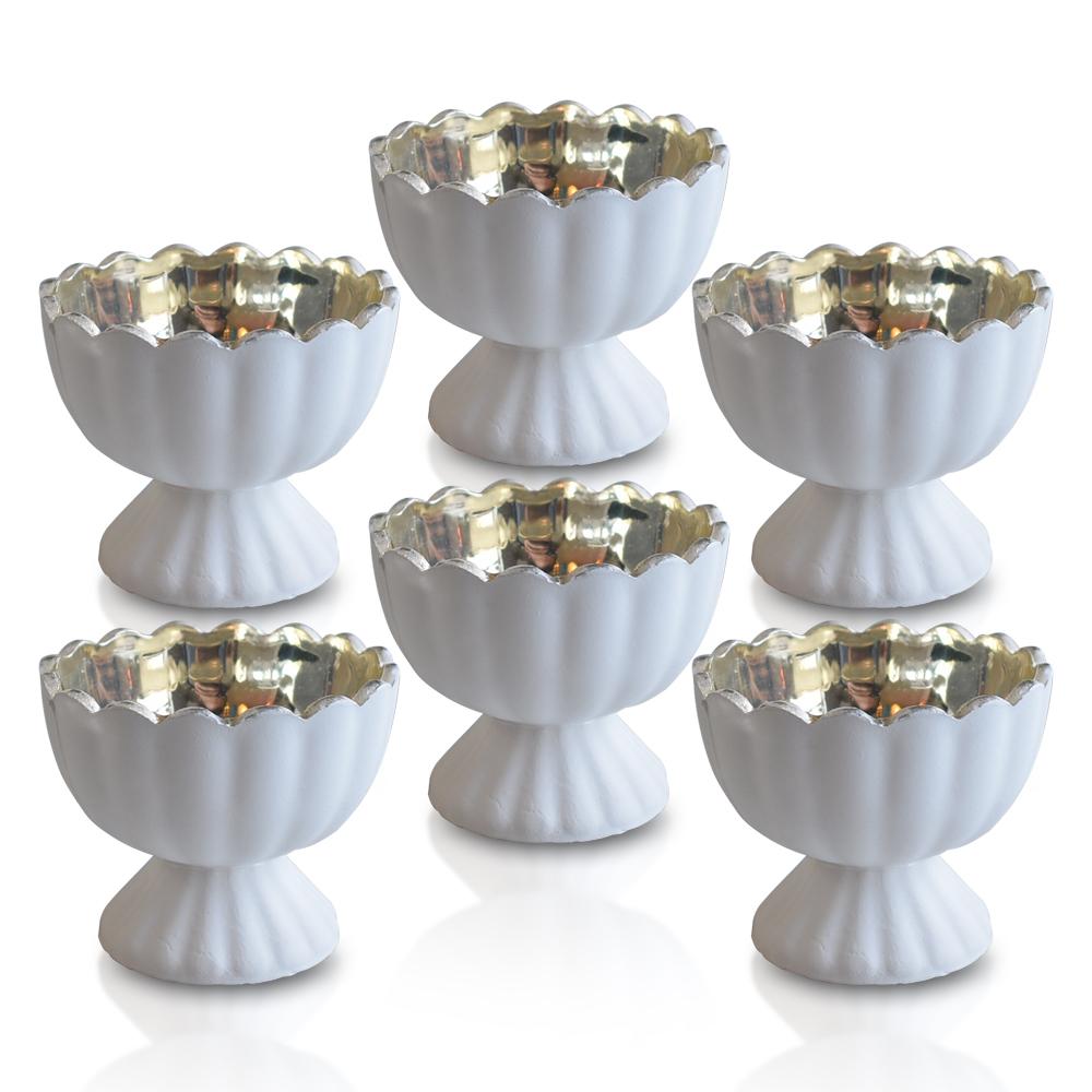 STUNNING ANTIQUE WHITE MERCURY GLASS CANDLE HOLDERS: Set of 6 - 3.5 inches x 3 inches high. Antiqued metallic finish of our mercury glass is reflective and shimmery, enhancing candle light. Perfect for any celebration. Not for food use. For use with tea light candles.