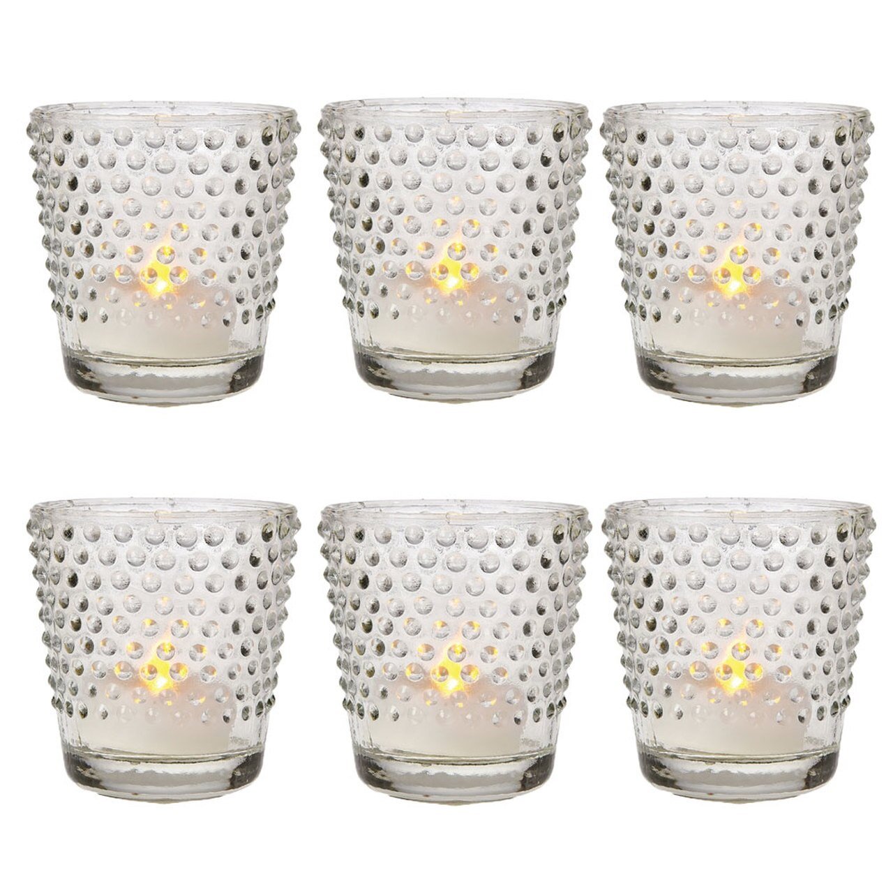 STUNNING TEALIGHT OR VOTIVE HOLDERS - Each of the vintage glass tealight candle holders in this set measures 2.25" diameter x 2.5" height, with a hobnail design that enhance the romantic & dramatic vibe when you light the tea lights, flameless votives or LED lights inside them