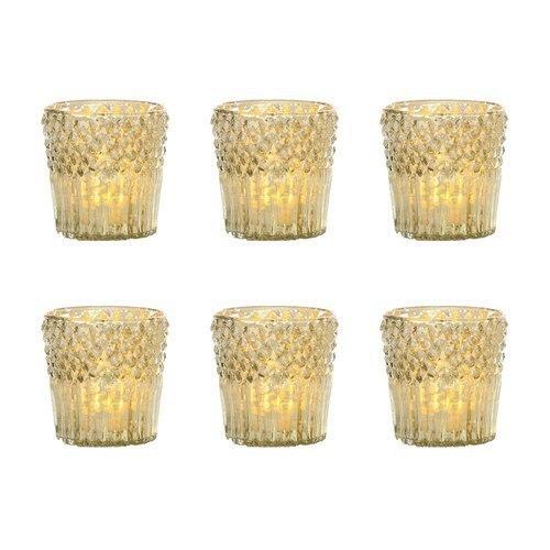 MERCURY GLASS CANDLE HOLDERS SET OF 6: These unique mercury glass tea light holders measure 2.75-inch diameter x 3 inches high. Antiqued metallic gold mercury finish, these candle holders easily compliment virtually any color scheme.