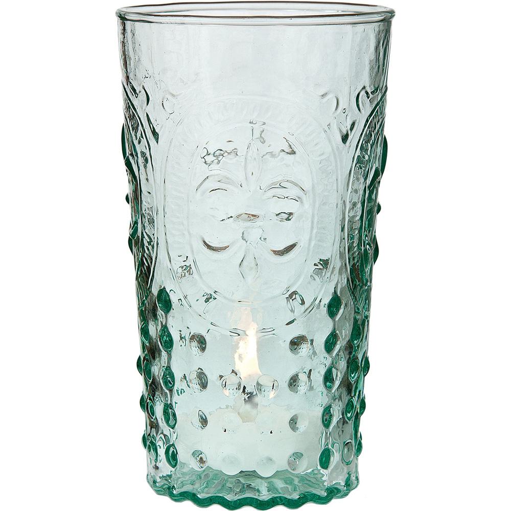 Food Safe Glassware. So versatile, it may serve as a votive candle holder, small vase or beverage glass. 3-inch diameter x 5.25 inches high with a 3 inch diameter opening. Holds approximately 13 ounces. Our assortment of vintage glass just wouldn't be complete without this historic color. Our vintage green is reminiscent of heavily collected coke green depression glass. Perfect for vintage weddings and centerpieces. For use with our flameless tea lights or regular tea lights.