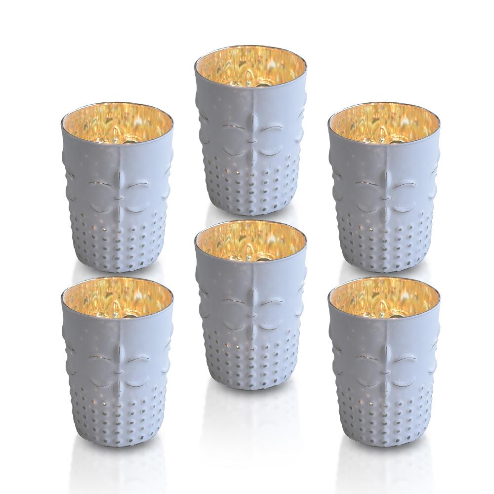 Antique White Fleur Mercury Glass Tealight Holders - Set of 6 - Our mercury glass candle holders have lovely fleur de lis design. They are the perfect addition to your holiday or event tables. Product Specifications Measurements: 3-inch diameter x 4-inches high. Food Use?: No Candle: For use with battery operated or real tea light *Please Note: As these are hand-crafted items, each piece may vary slightly in appearance from one another.