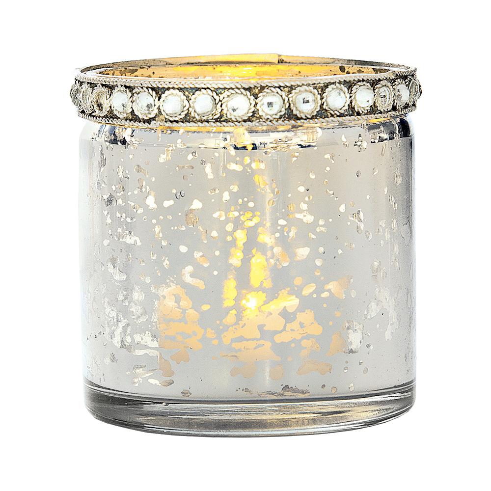BLOWOUT Vintage Mercury Glass Candle Holder with Rhinestones (2.5-Inch, Thea Design, Silver) - For Use with Tea Lights - For Home Decor, Parties, and Wedding Decorations