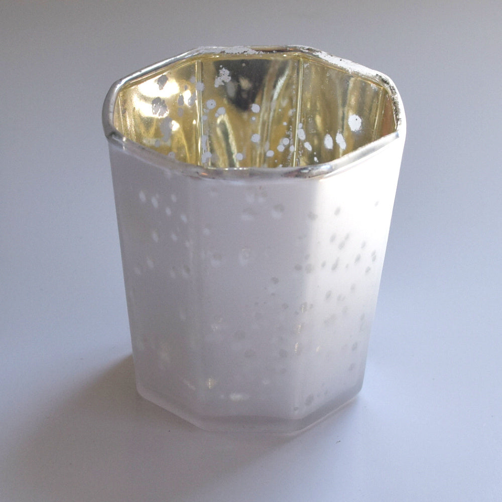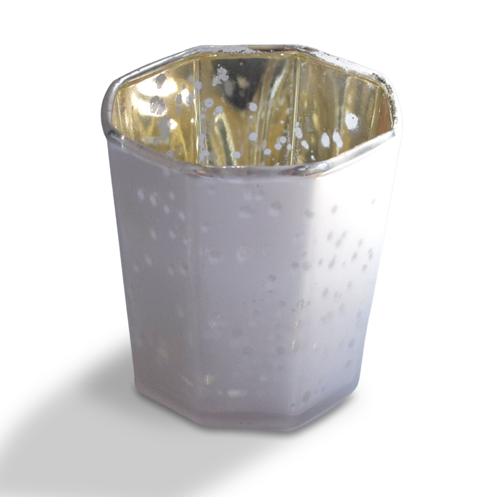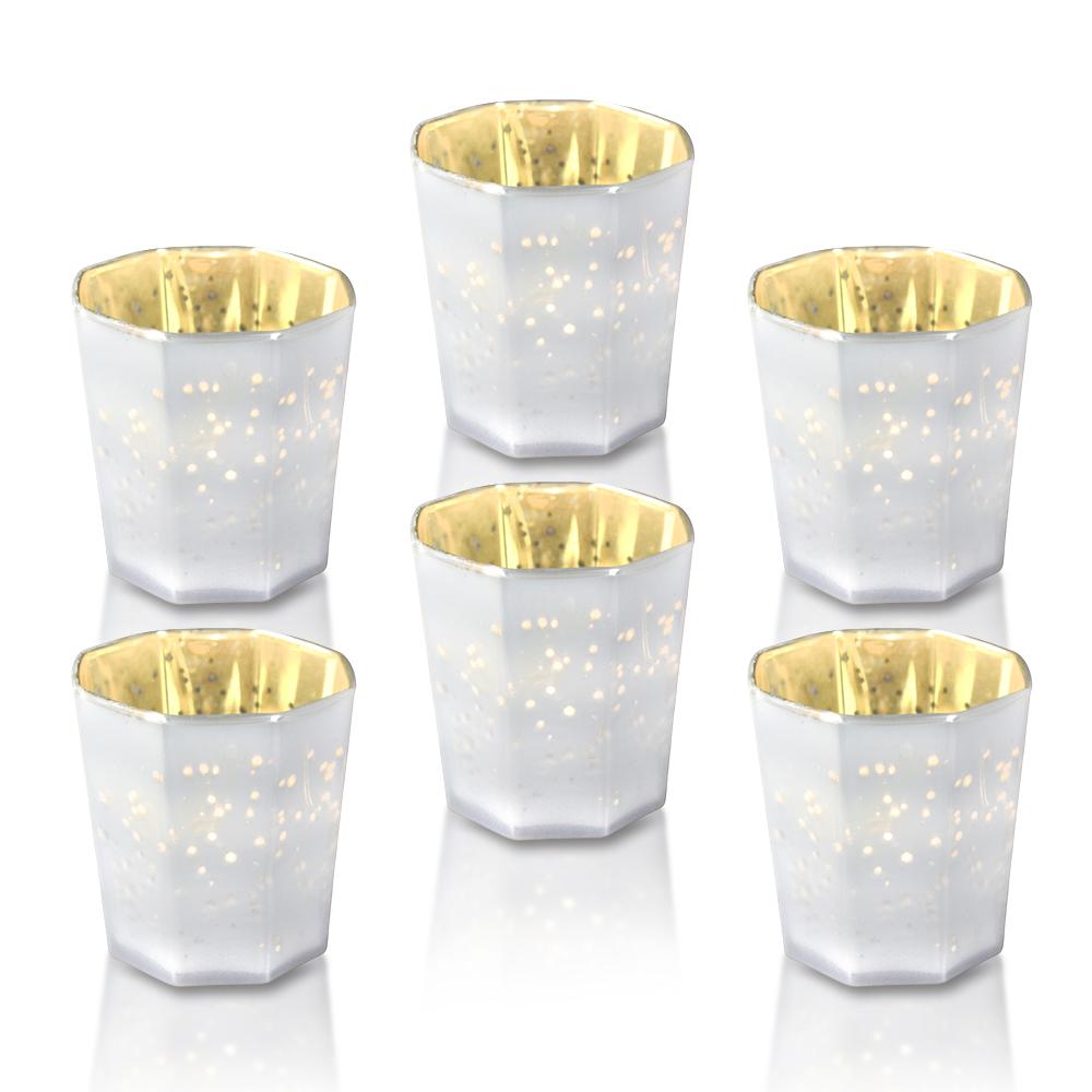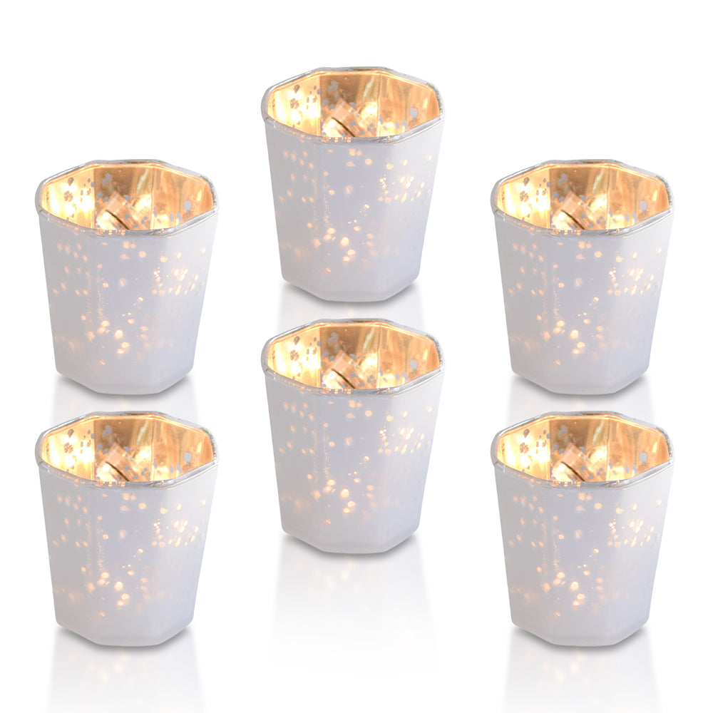 Set of 6 Pearl White Patricia Mercury Glass Tealight Holder - Our flat sided mercury glass candle holders are truly unique. They are the perfect addition to your holiday or event tables. Product Specifications Measurements: 2.75-inch diameter x 2.75-inches high. Food Use?: No Candle: For use with battery operated or real tea light *Please Note: As these are hand-crafted items, each piece may vary slightly in appearance from one another.