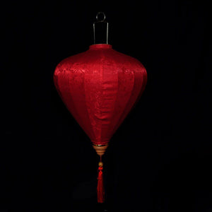 These Vietnamese Silk Lantern in a garlic umbrella shape are made from 100% Brocade silk fabric with weave designs stretched over a high-quality metal frame. These Silk Lanterns look beautiful for any event or stage setting and are meant to bring good fortune.