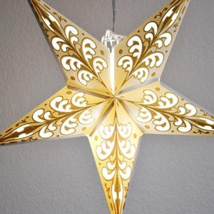 Product Specifications: Color: Gold. Dimensions: 24" Diameter. Material: Heavy-Duty Paper. Lighting:Included! Triple Socket Cord - 1x 19FT Outdoor Rated Cord with 3x Evenly-Spaced Sockets and LED Shatterproof Light Bulbs. What's Included?: 3x Foldable Star Lanterns, 1x Triple-Socket Pendant Lamp Cord, and LED Shatterproof Light Bulbs Total Cord Length: 19FT Spacing Between Sockets: ~39" Drop Distance: ~ 23.6 " Spacing Between Sockets: ~39" Distance from Plug to On/Off Switch: 37" Distance from On/Off Switch to 1st Junction: 98" Distance from 1st Junction to 2nd Junction: 39" Distance from 2nd Junction to 3rd Junction: 39"