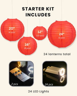 ✔ 24 Red Paper Lanterns – A mix of sizes from 12" to 24" round lanterns to create a dreamy ambiance (Ten 12" lanterns, Eight 16" lanterns, Four 20" lanterns, Two 24" lanterns)
